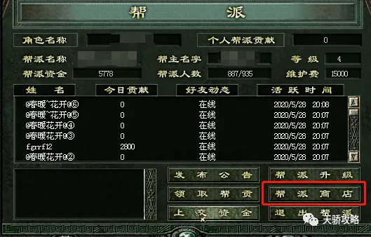 通过“X”键或者点帮派按钮,打开帮派界面的帮派商店。