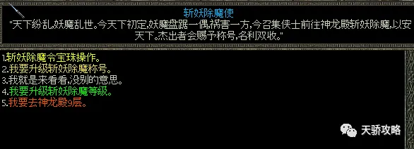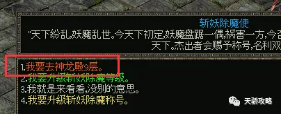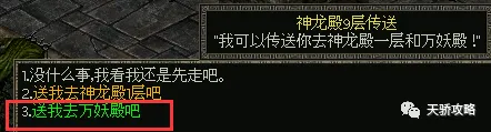 打3组碎片,至少合成3个镇妖符,找副本里面的NPC(神龙殿9层传送)对话,进入万妖殿之前,把内挂开了,进入万妖殿是内挂状态。
