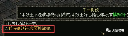 消耗一个镇妖符后,可以激活千年树妖BOSS。击杀千年树妖后,可以获得