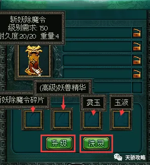 放入斩妖除魔令、斩妖除魔令碎片和灵清玉。点升级,完成对斩妖除魔令技能等级的升级。