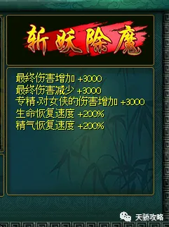 升到第五级后,第五条属性获得1个斩妖除魔技能,高级强力眩晕,高级强力中毒,高级强力冰冻,高级强力失明,高级强力石化其中一条,此状态攻击和之前的状态攻击不一样,之前的抗性无法抵抗斩妖除魔令上的这条状态攻击。