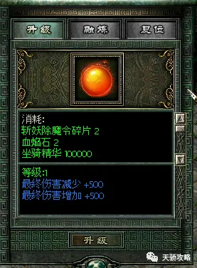 每次升级100%成功,满级为3级,每次升级消耗一定的月华,精华,斩妖除魔令碎片和血焰石,一共消耗6个血焰石即可满级,血焰宝珠随着升级,自身的增减伤属性也会提高,当升级到第3级最高级的时候,会额外随机出现一条属性,并且3级的血焰宝珠可以进行交易。