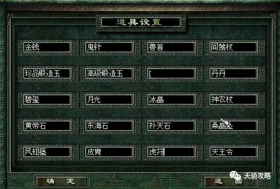兽首盔+金钱+神农杖+鬼针+冰晶+月光石+壁玺+丹丹的木偶+珍品锻造玉+高级锻造玉+黄帝石+注魂石+[w寒冰神铁]++桑晶坠+阎煞杖+寒冰神铁+东海石+补天石+凤翅盔+金丝锁子甲+鱼鳞甲+[w黄玉牌]+[u骄子碎片]+[u羊羊得意]