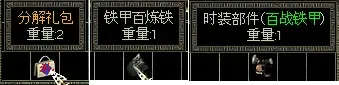 分解礼包可以开出布衣百结丝、时装部件(纯情布衣)铁甲百炼铁、时装部件(百战铁甲)
