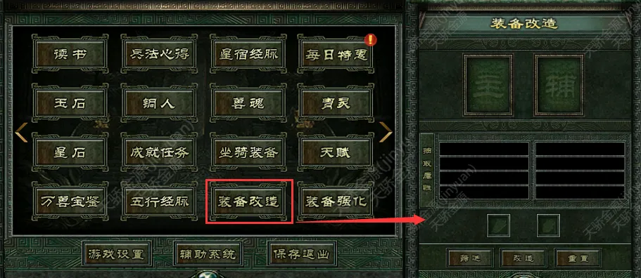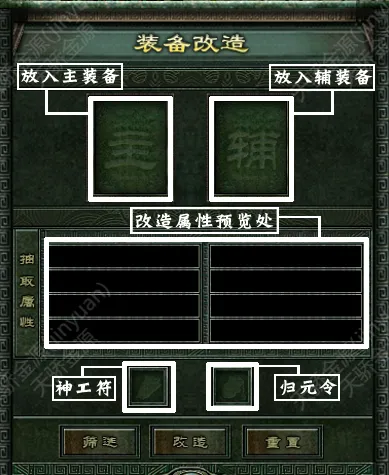 ※点击重置按钮将消耗归元令进行重置操作,重置将清除主装备所有改造属性以及改造等级,改造等级越低,所需材料越多,请注意系统提示