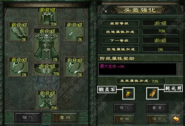 ※乾元符:放入后可提高每次强化成功几率,每强化1次消耗1个,不放入该物品也可以进行强化