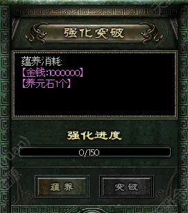 突破需消耗物品【养元石】(背包中直接扣除)与金钱,点击藴养,即消耗材料与金钱增加强化进度,进度达到上限即可突破至下一等阶