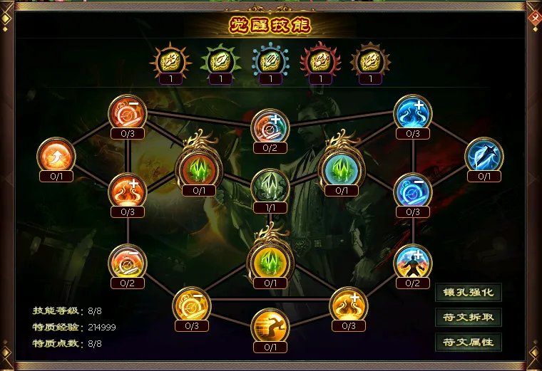 2、学习天赋需要特质点数,特质点可以通过升级符文镶孔强化与技能等级提升获得,一共可获得28点