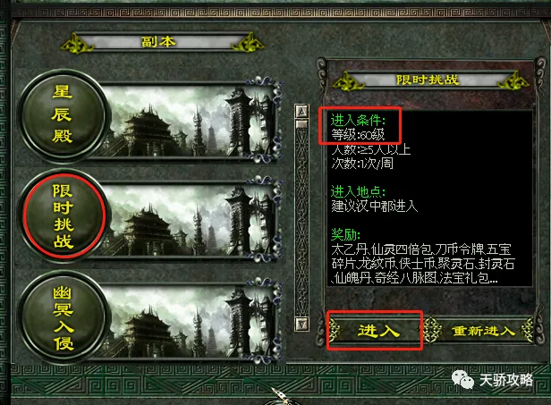 限时挑战是天骄唯一的一个1级角色就能进的副本。在大神玩家的开发下,挑战副本成了小号升级最快速的途径。